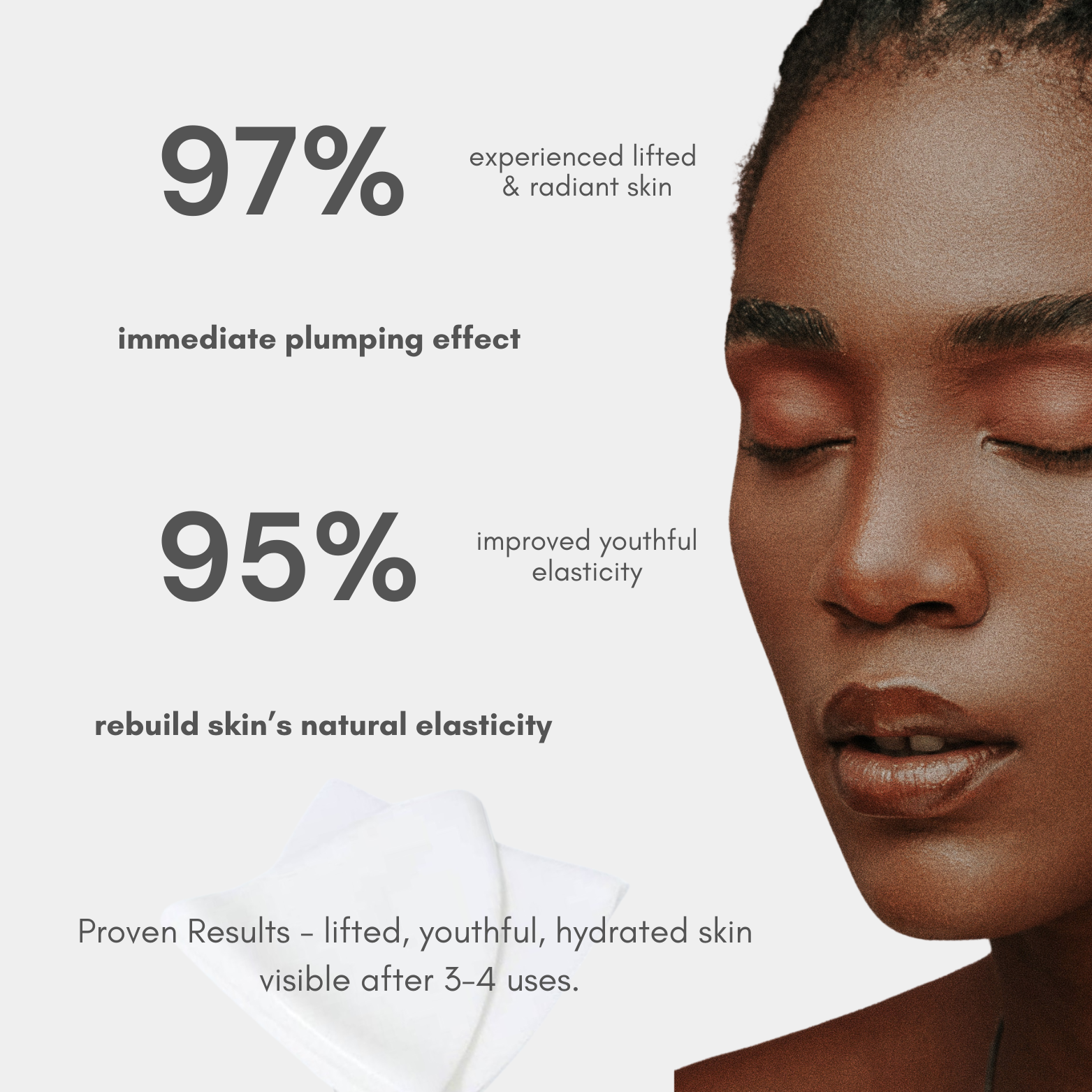 You’ll feel an instant tightening effect after the second use, with visibly firmer and smoother skin over time.